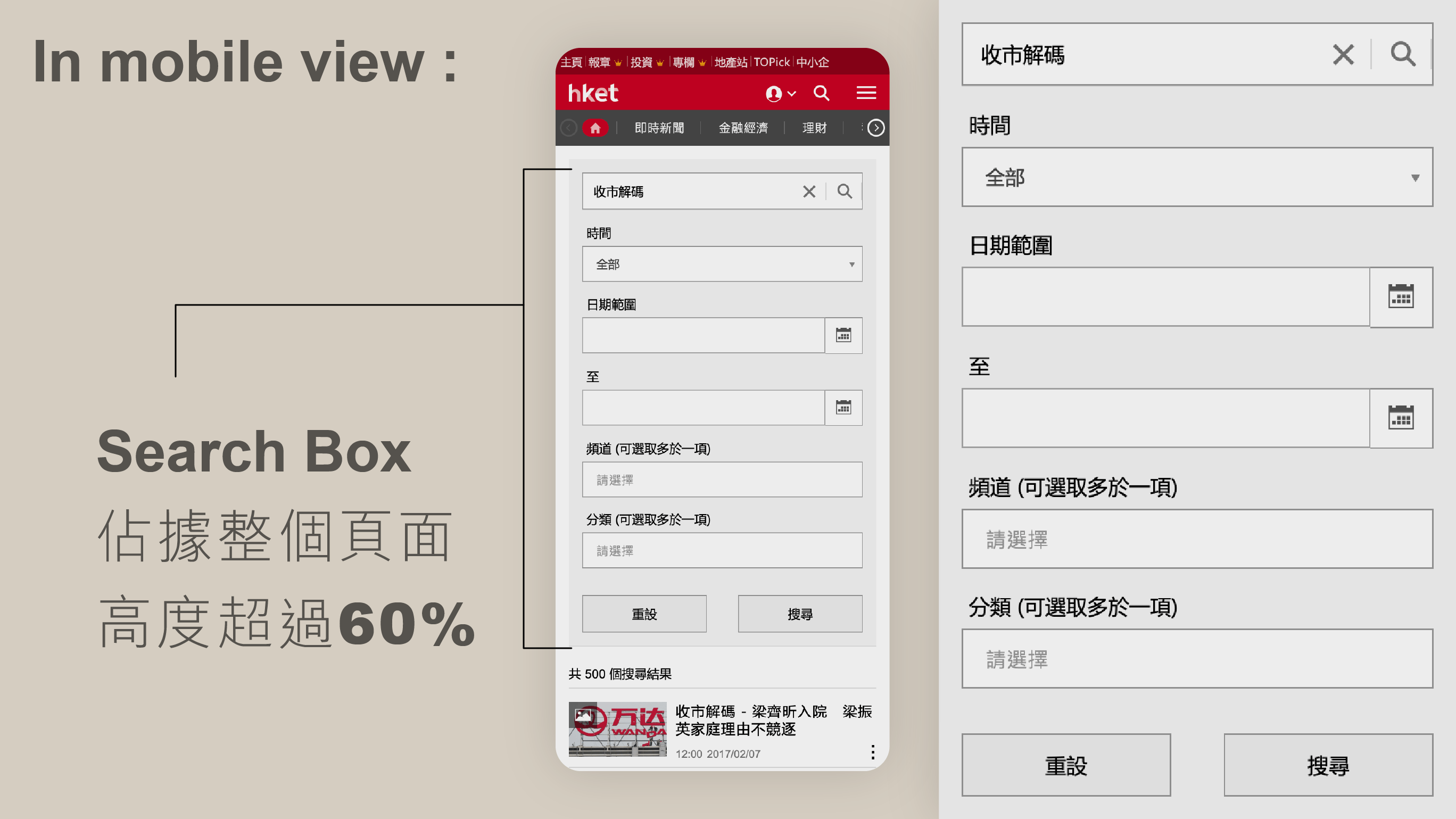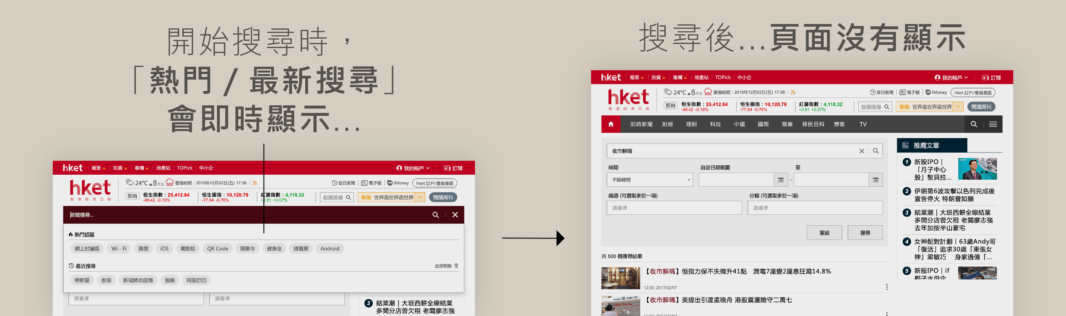 網站運作多年以來,搜尋結果頁在用戶體驗方面仍有許多改進空間。導航結構與搜尋功能尚未達到理想的直覺性與便利性,且隨著行動端流量遂年增加,行動裝置上的瀏覽體驗也需極力提升。